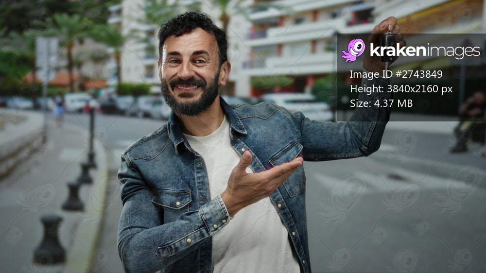 Hispanic man with beard holding car keys on a vibrant outdoor street scene, showcasing urban lifestyle and modern transportation amid bustling city background. - Kraken Images