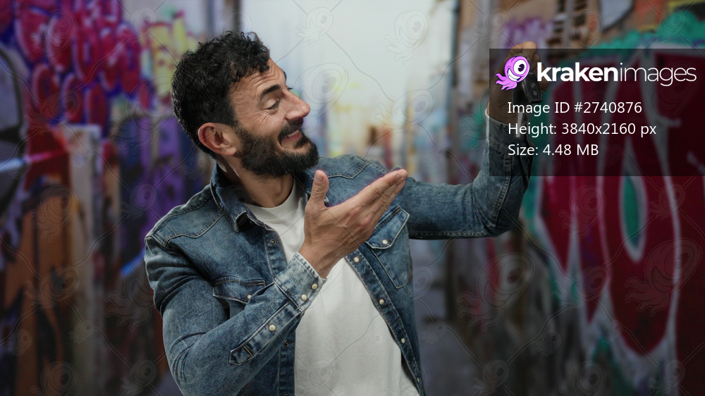 Hispanic man with beard holding keys outdoors on graffiti-covered street, showcasing a joyful expression.