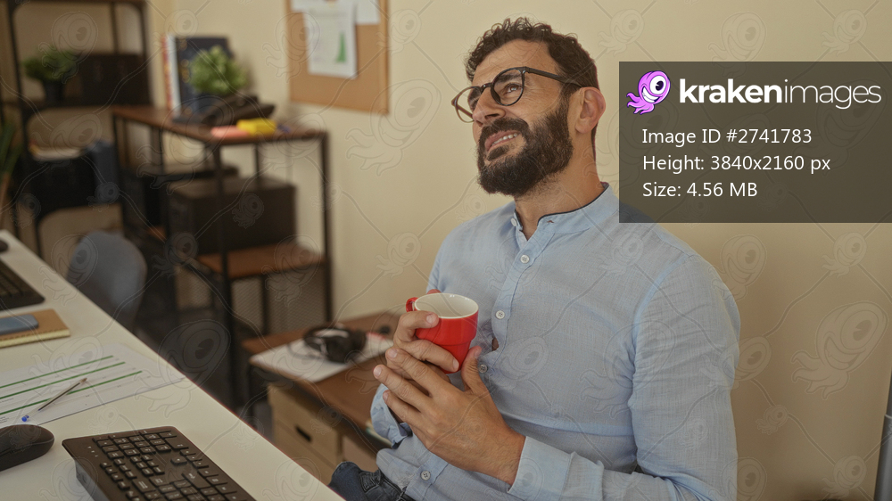 Hispanic man with beard holding red mug in office setting, wearing glasses and blue shirt, surrounded by desk items, relaxed atmosphere, indoor environment. - Kraken Images