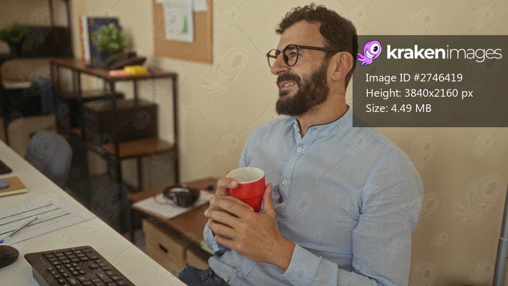 Hispanic man with beard holding red mug in office setting, wearing glasses and blue shirt, surrounded by desk items, relaxed atmosphere, indoor environment. - Kraken Images