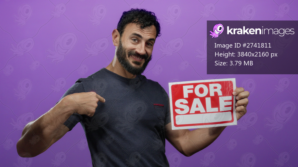 Hispanic man with beard holds a for sale sign against a purple background, smiling confidently.
