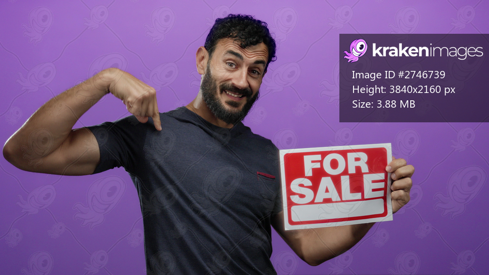 Hispanic man with beard holds a for sale sign against a purple background, smiling confidently.