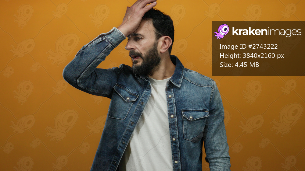 Hispanic man with beard in denim shirt against vibrant orange background showing thoughtful expression and gesturing energetically.
