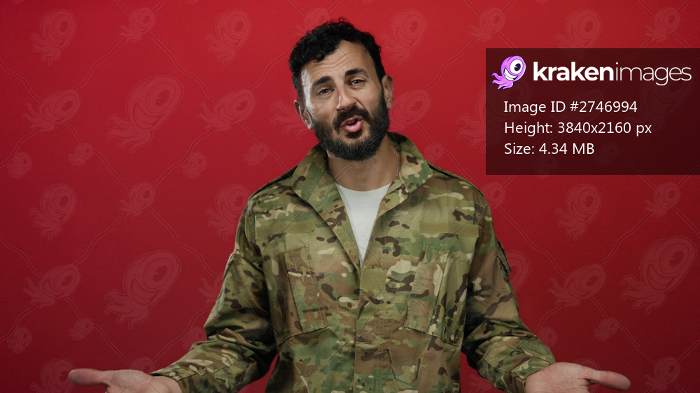 Hispanic man with beard in military uniform against red background looking confidently towards camera conveying a sense of pride and authority