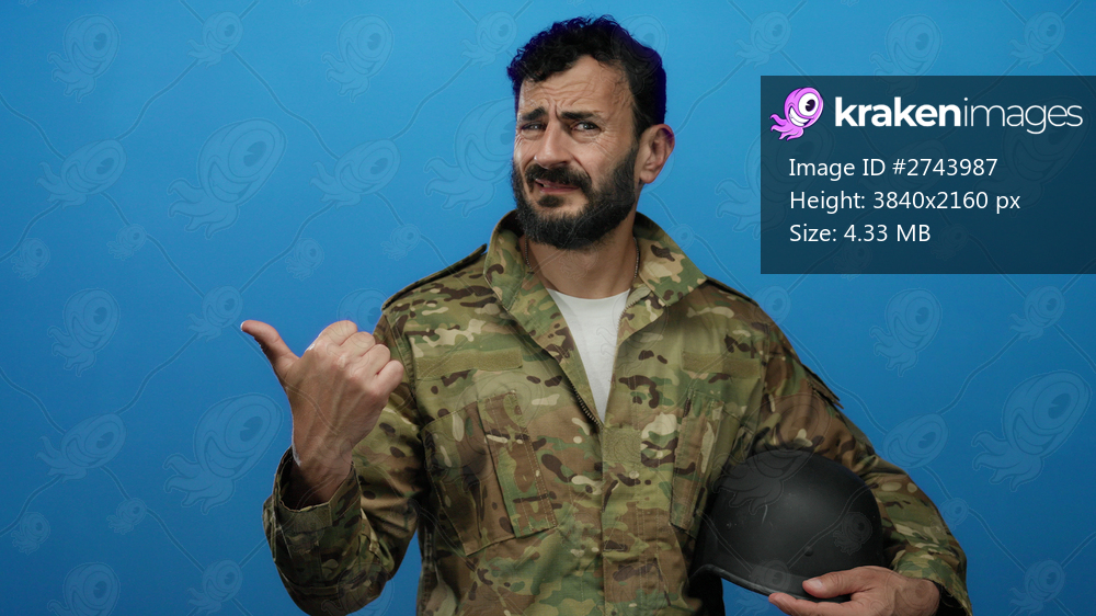 Hispanic man with beard in military uniform holding helmet against blue background, exhibiting a thoughtful expression and gesturing with his thumb.