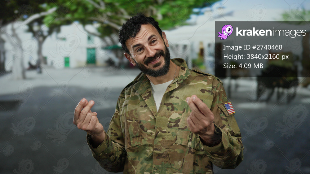 Hispanic man with beard in military uniform performs money gesture outdoors on a sunny street with trees in the background.