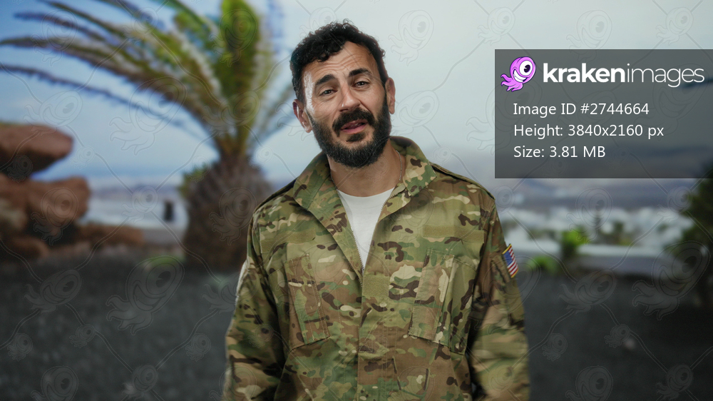 Hispanic man with beard in military uniform stands outdoors in a park with lush greenery and trees.