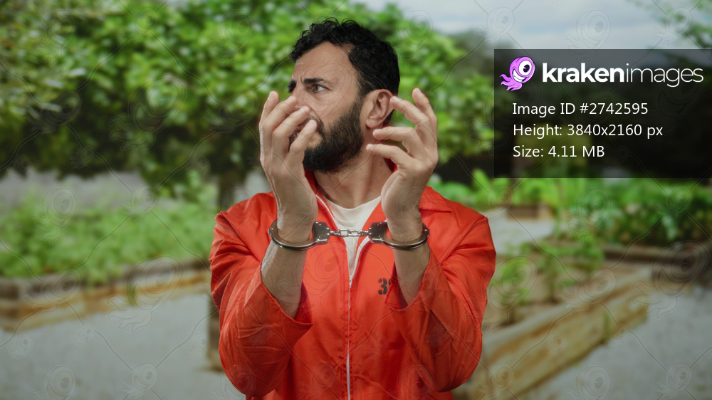 Hispanic man with beard in orange jumpsuit handcuffed in a green park surrounded by trees.