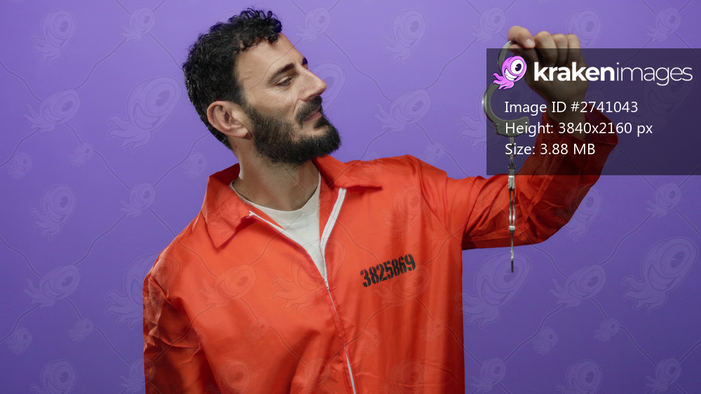 Hispanic man with beard in orange prison jumpsuit holding handcuffs against purple background, symbolizing incarceration and justice system.