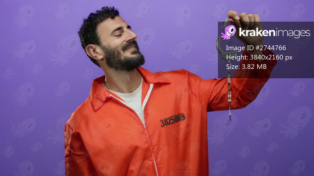 Hispanic man with beard in orange prison jumpsuit holding handcuffs against purple background, symbolizing incarceration and justice system.