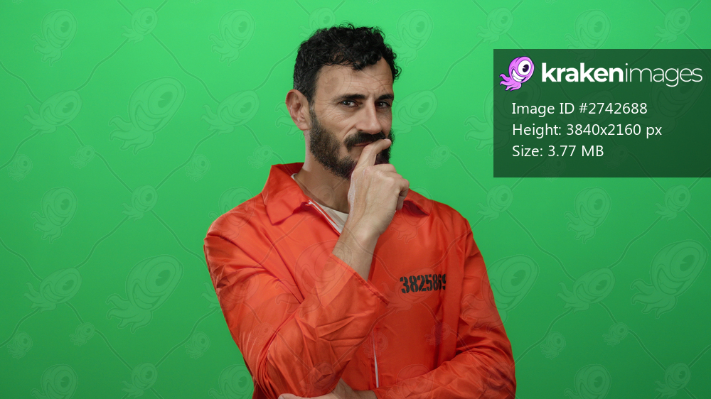 Hispanic man with beard in orange prison jumpsuit stands thoughtfully against a vibrant green background, symbolizing contemplation and incarceration.