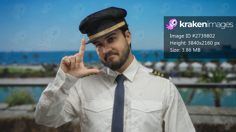 Hispanic man with beard in pilot uniform making loser gesture at the seaside promenade with tranquil blue sea and palm trees in the background.