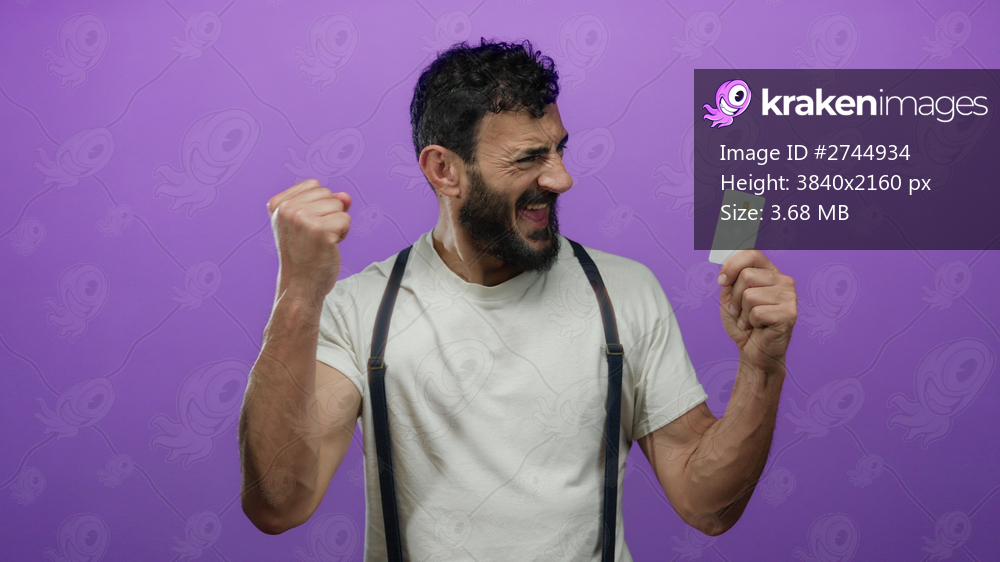 Hispanic man with beard joyfully holds a credit card in front of a vibrant purple background, exuding excitement and success.