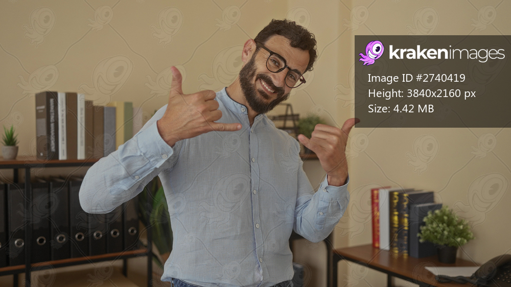 Hispanic man with beard making call me gesture in a casual blue shirt smiles confidently in a modern office setting surrounded by plants and books.