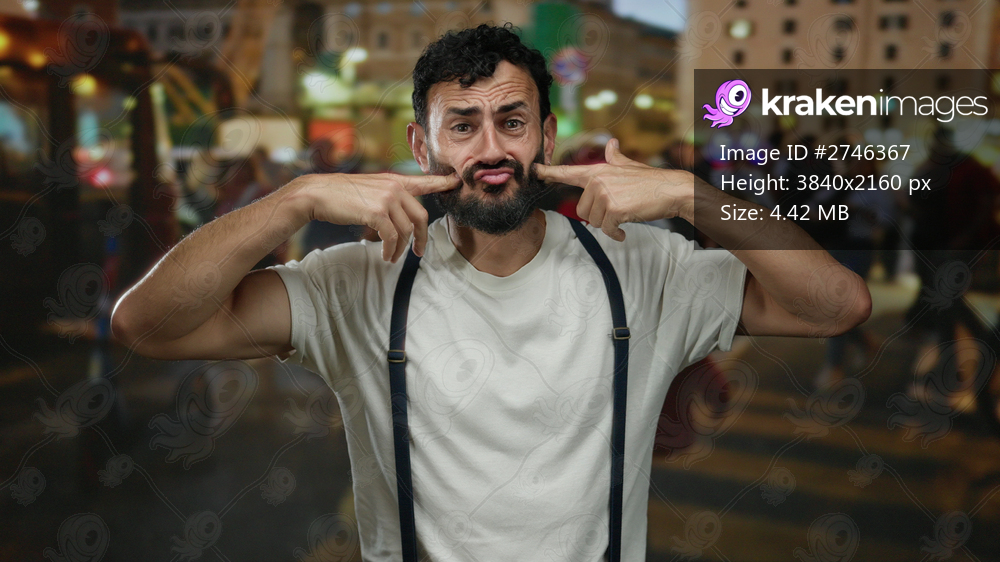 Hispanic man with beard making expressive gestures in bustling outdoor street wearing casual suspenders amid busy urban night scene.