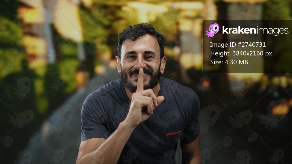 Hispanic man with beard outdoors in street making silence gesture with finger on lips
