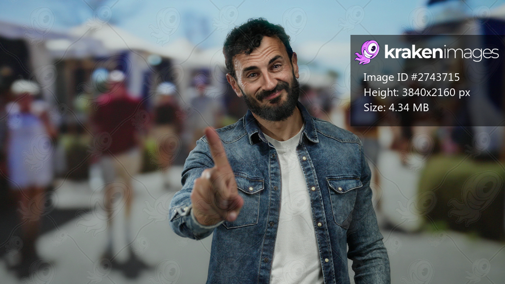 Hispanic man with beard outdoors on street gesturing no with finger in bustling urban setting surrounded by people.
