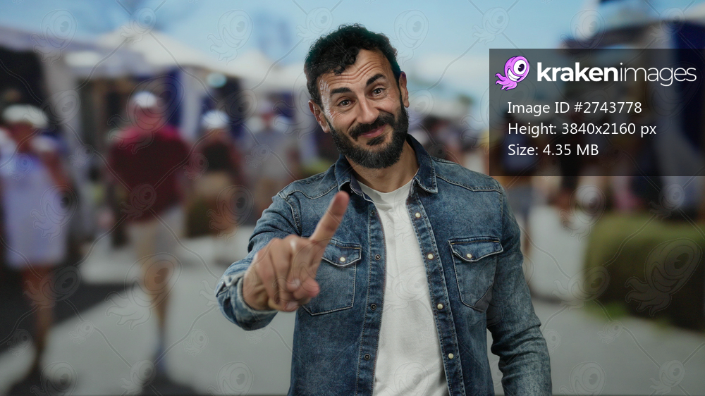 Hispanic man with beard outdoors on street gesturing no with finger in bustling urban setting surrounded by people.