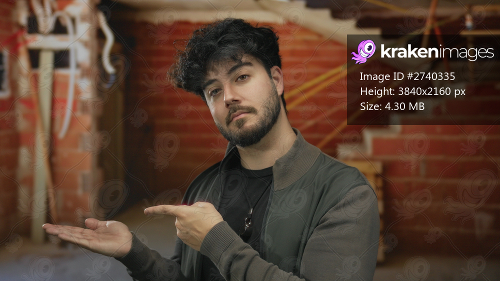 Hispanic man with beard pointing at his palm inside construction site with unfinished brick walls and visible wiring.