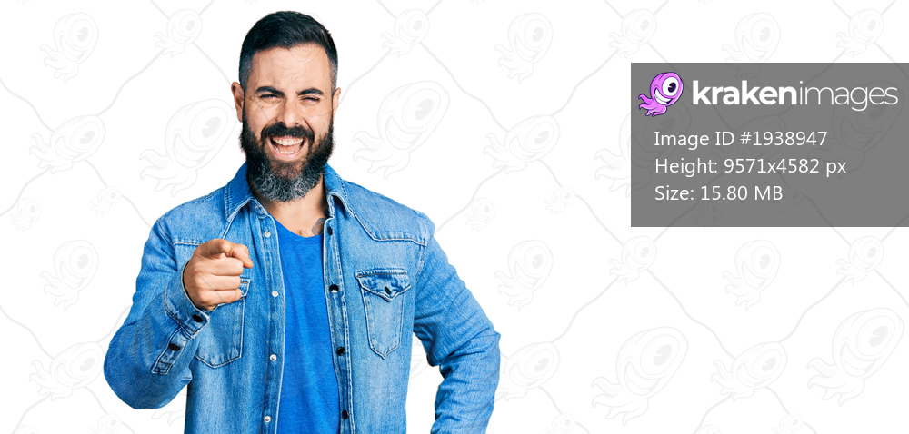 Hispanic man with beard pointing with finger to camera smiling and laughing hard out loud because funny crazy joke.