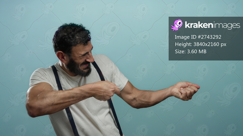 Hispanic man with beard pretending to pull rope against plain blue background, showcasing humorous action and expressive muscle tension.