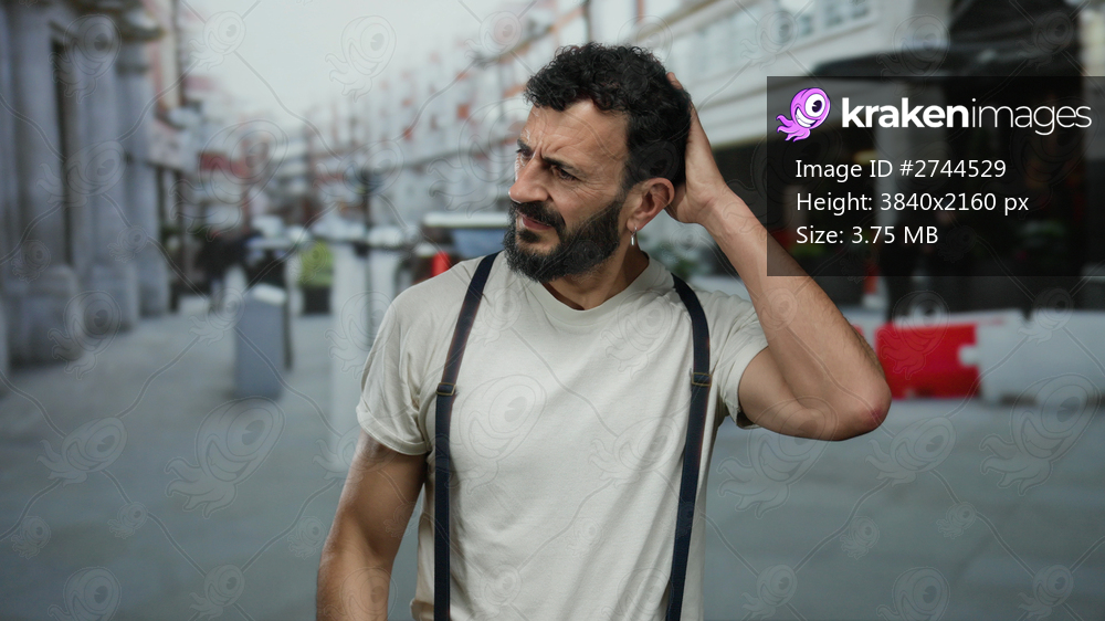 Hispanic man with beard scratching head on busy city street during daytime showcasing confusion and thoughtfulness in an urban setting with buildings and barriers in background - Kraken Images
