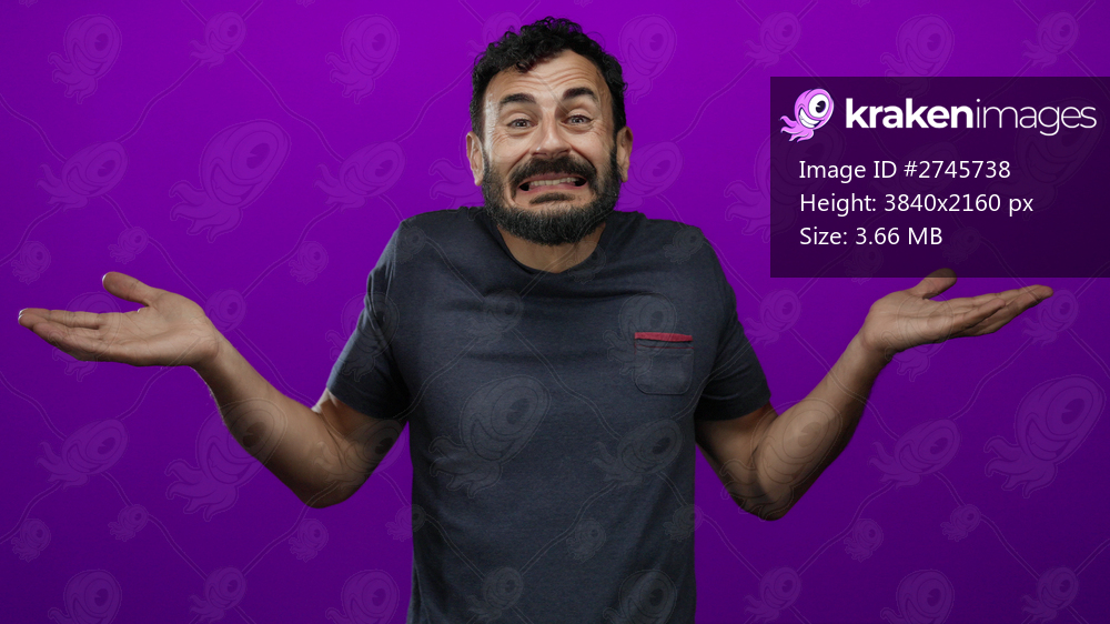 Hispanic man with beard shrugs against a vibrant purple background, conveying confusion and uncertainty, hands raised in a questioning gesture in a studio setting. - Kraken Images
