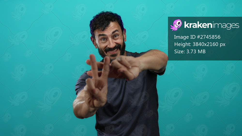 Hispanic man with beard smiling and gesturing hashtag symbol against vibrant blue background.