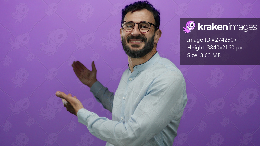 Hispanic man with beard smiling and gesturing towards purple background wearing glasses showcasing a positive scene