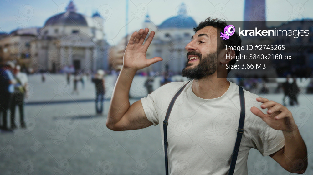 Hispanic man with beard smiling outdoors, wearing white shirt in urban street setting, lively interaction captured against blurred historical architecture background - Kraken Images