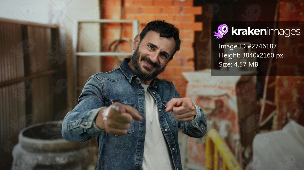 Hispanic man with beard smiling and pointing in a friendly manner at a construction site wearing a denim jacket with brick and tools in the background creating a casual and engaging scene. - Kraken Images