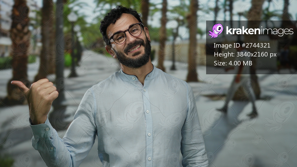 Hispanic man with beard standing on outdoor street smiling with glasses palm trees