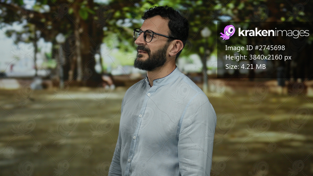 Hispanic man with beard standing outdoors in a sunlit park with green trees and peaceful ambiance, wearing glasses and a light shirt, portraying a serene expression. - Kraken Images