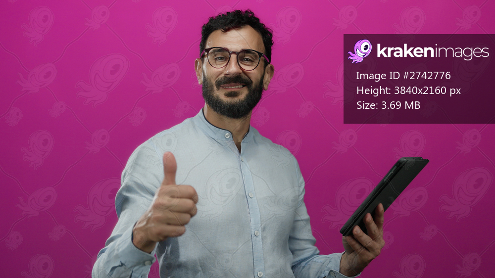 Hispanic man with beard uses tablet against vibrant pink background, expressing enthusiasm with a thumbs-up gesture, showcasing modern technology interaction. - Kraken Images