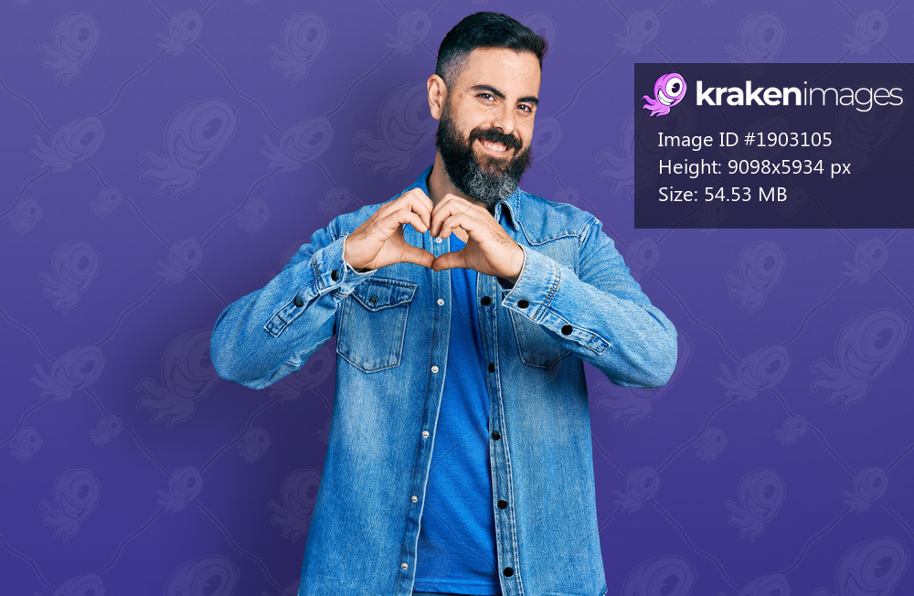 Hispanic man with beard wearing casual denim jacket smiling in love doing heart symbol shape with hands. romantic concept.