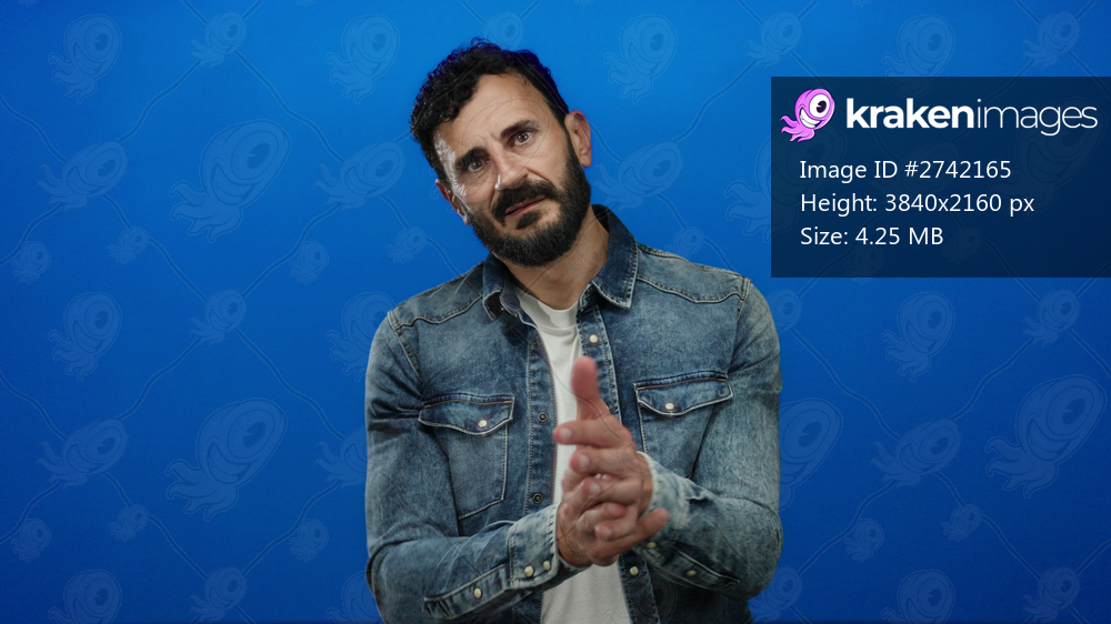 Hispanic man with beard wearing denim shirt and white t-shirt gestures expressively against blue background.