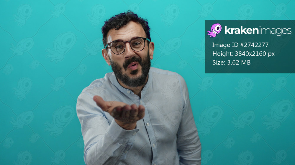 Hispanic man with beard wearing glasses making kiss gesture against vibrant blue background, expressing warmth and friendliness with playful and inviting demeanor. - Kraken Images