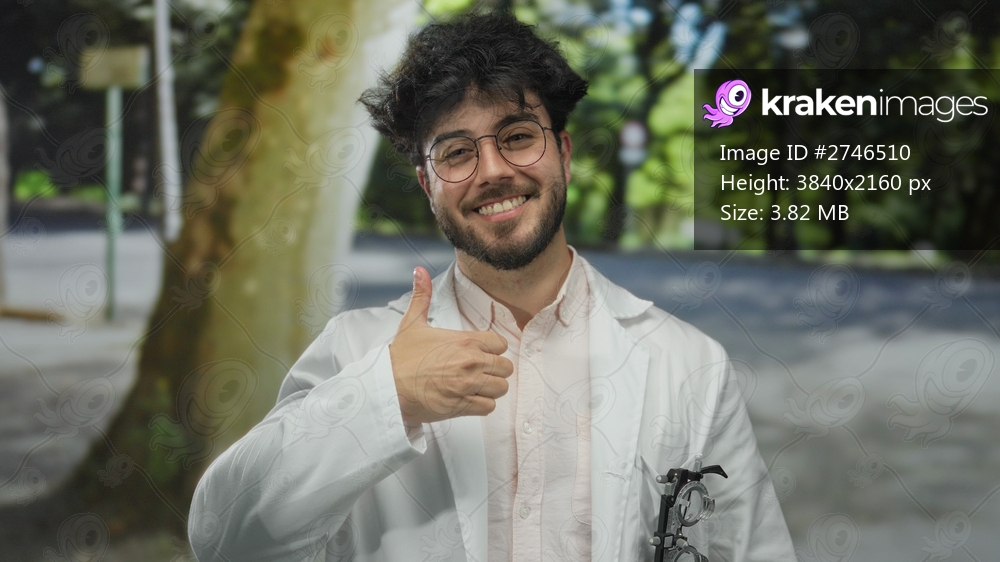 Hispanic man with beard wearing glasses and white coat gives thumbs up in a green outdoor park setting.
