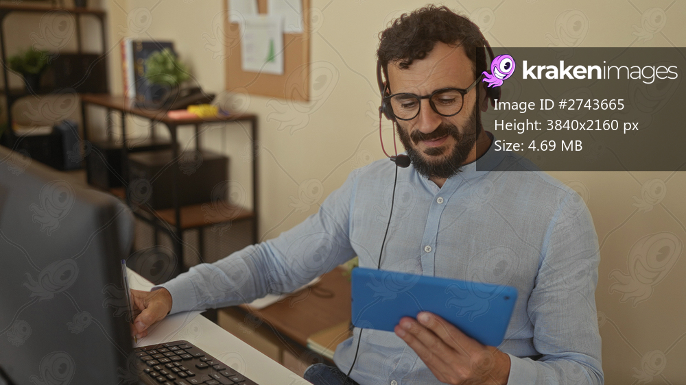 Hispanic man with beard wearing headset holding tablet while gesturing during online meeting in office environment with shelves and charts in background reflecting modern workspace. - Kraken Images