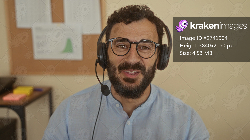 Hispanic man with beard wearing headset smiles and talks in an office setting with charts on the wall and colorful sticky notes in the background.