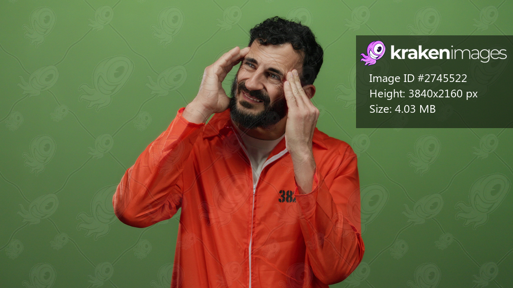 Hispanic man with beard wearing orange jumpsuit stands against green background appearing distressed and contemplative.