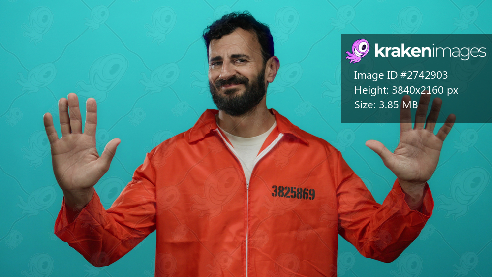 Hispanic man with beard wearing orange prison jumpsuit stands against blue background with hands raised in a calm gesture suggesting a surrender or stop scenario. - Kraken Images