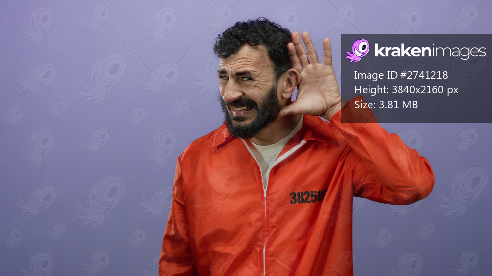 Hispanic man with beard wearing prison jumpsuit gestures listening against purple background.
