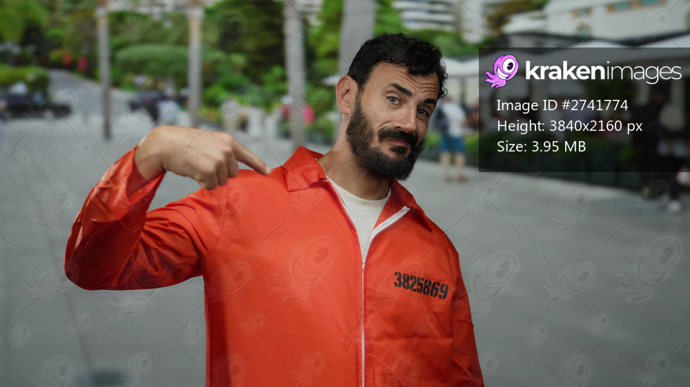 Hispanic man with beard wearing prison jumpsuit stands confidently on a busy street, pointing at himself with a smirk, surrounded by urban outdoor scenery. - Kraken Images