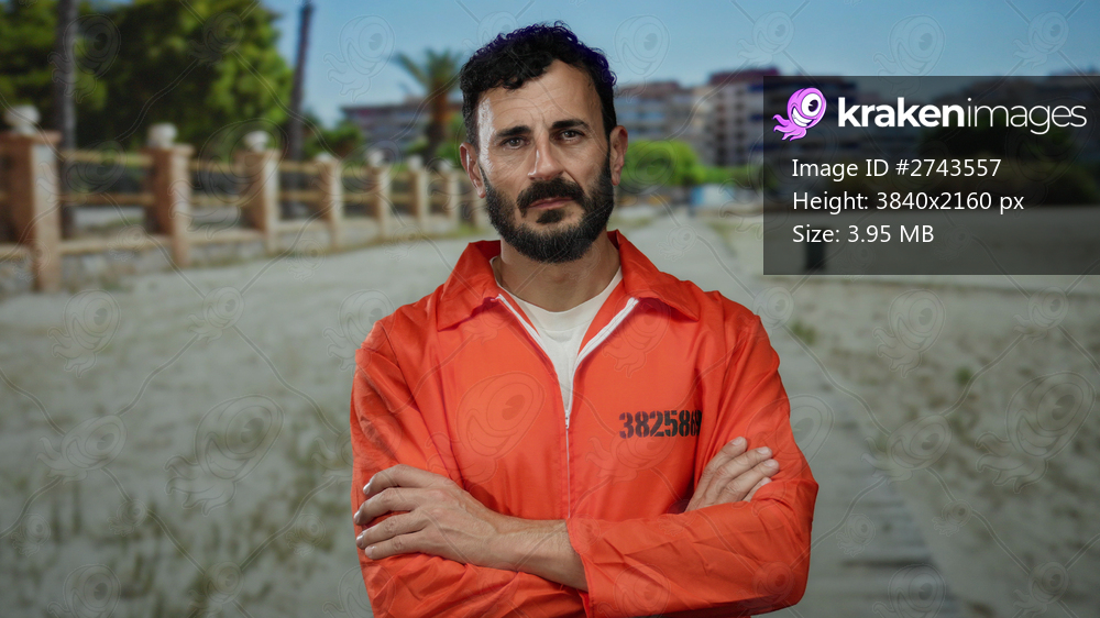 Hispanic man with beard wearing prison jumpsuit stands solemnly on a quiet beach with sea and buildings in the backdrop, conveying a narrative of contemplation and freedom. - Kraken Images