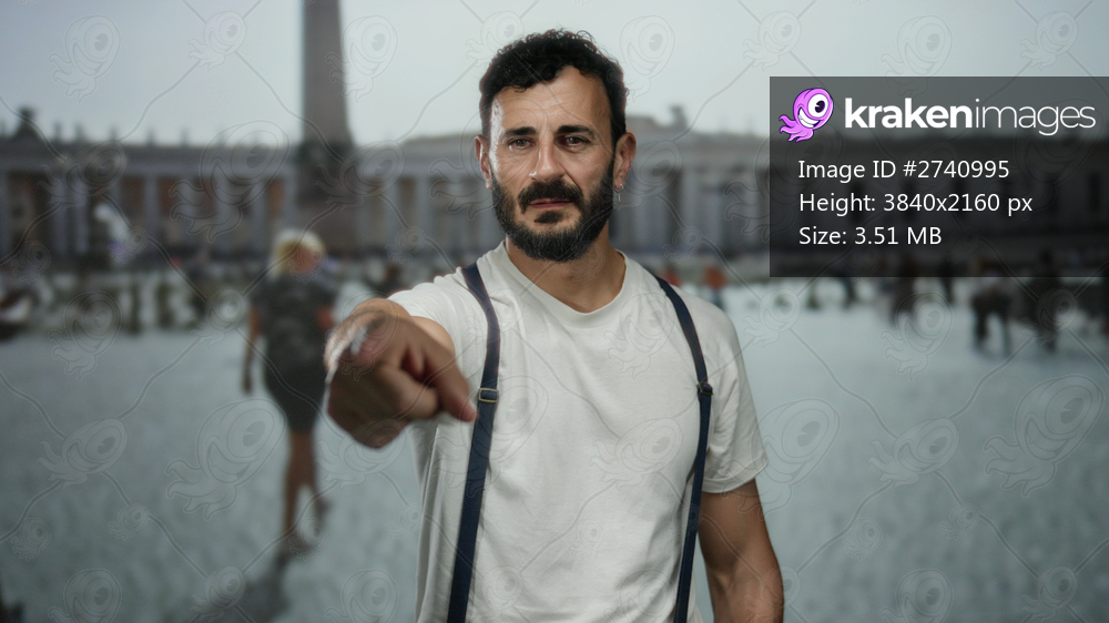 Hispanic man with beard wearing suspenders points in old town rome with blurred obelisk background capturing urban exploration mood.