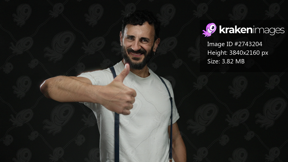 Hispanic man with beard wearing suspenders and white shirt gives thumbs-up against black background, exuding positivity and confidence with a cheerful smile and upbeat gesture. - Kraken Images
