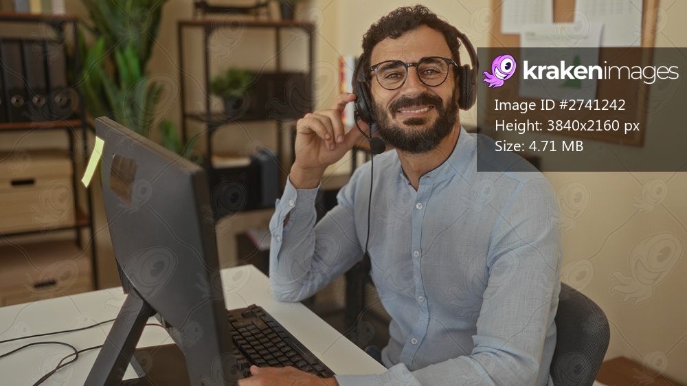 Hispanic man with beard working on a computer in a modern office setting wearing a headset surrounded by plants and office decor creating a contemporary work environment. - Kraken Images