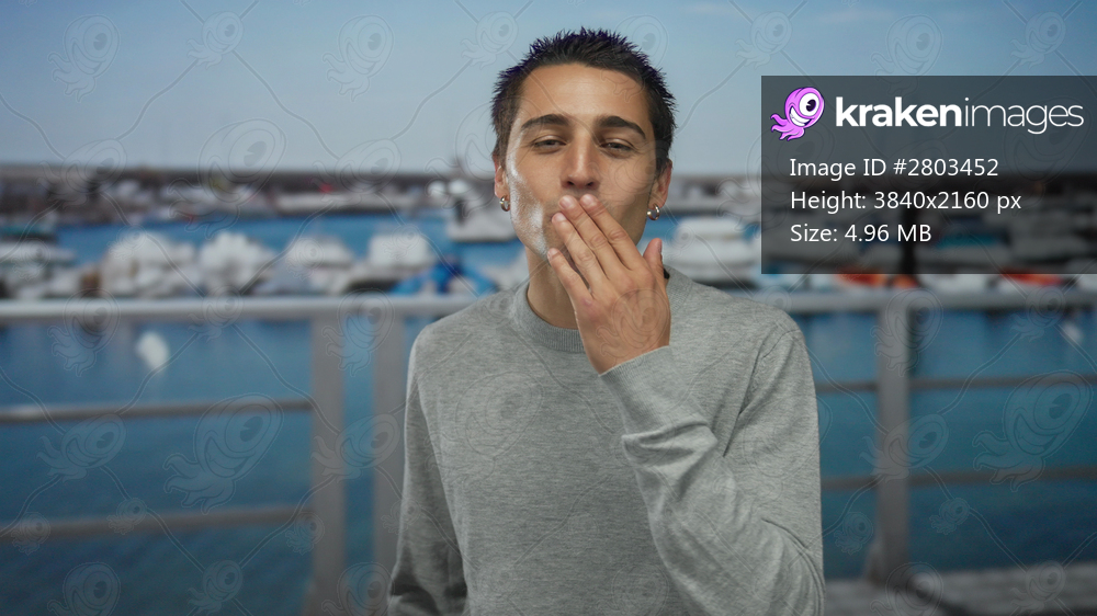 Hispanic man blows kiss to camera at sunny port dock by blue sea with boats in background; affection warmth intimacy connection.