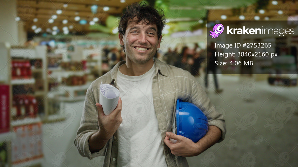 Hispanic man with blue hardhat and blueprints smiling in shopping mall, blending construction themes with modern retail environment.